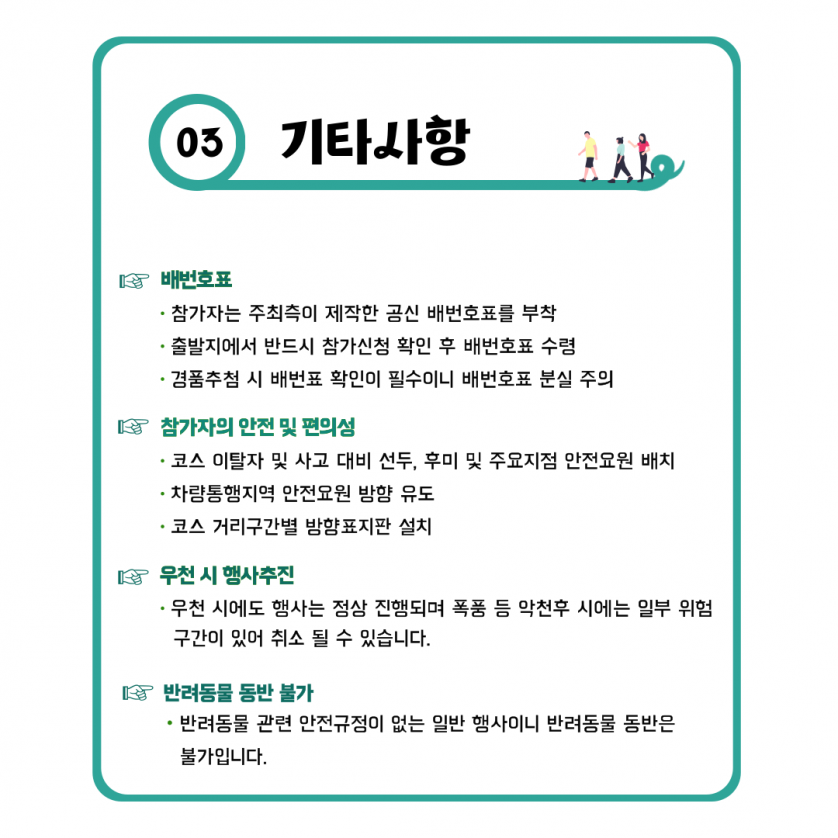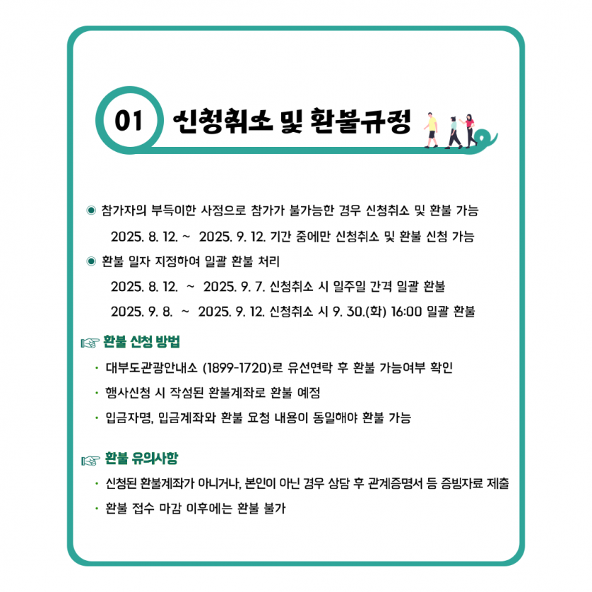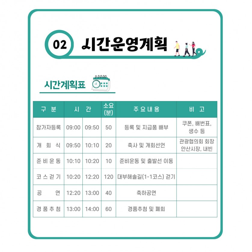 - 마감 제7회 대부해솔길 in 서해랑길 걷기축제행사 기간 2023년 09월 16일(토)신청 기간 2023년 08월 01일(화) ~ 2023년09월 12일(화)행사 장소 대부바다향기테마파크 잔디광장신청 비용 10,000원주최/주관 문화체육관광부, 안산시/ (사)안산시관광협의회로고 설명