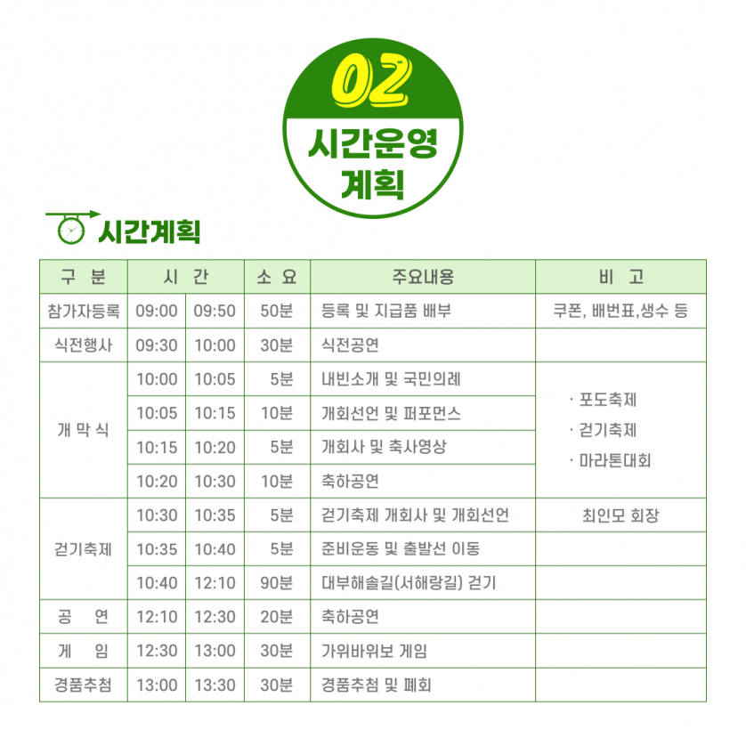 - 마감 제7회 대부해솔길 in 서해랑길 걷기축제행사 기간 2023년 09월 16일(토)신청 기간 2023년 08월 01일(화) ~ 2023년09월 12일(화)행사 장소 대부바다향기테마파크 잔디광장신청 비용 10,000원주최/주관 문화체육관광부, 안산시/ (사)안산시관광협의회로고 설명