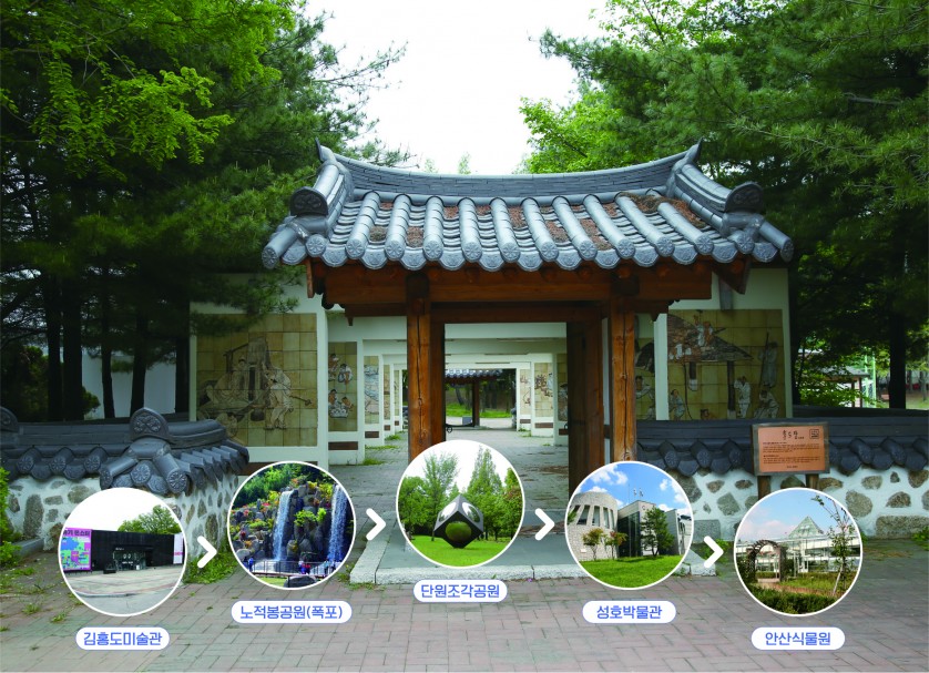 이곳에서 '나드리길(안산자락길)'을 따라 걷다 보면 도착하는 단원조각공원에는 김홍도의 대표 작품을 재해석한 벽화와 조각 작품들이 전시되어 예술산책로의 정취를 더합니다.